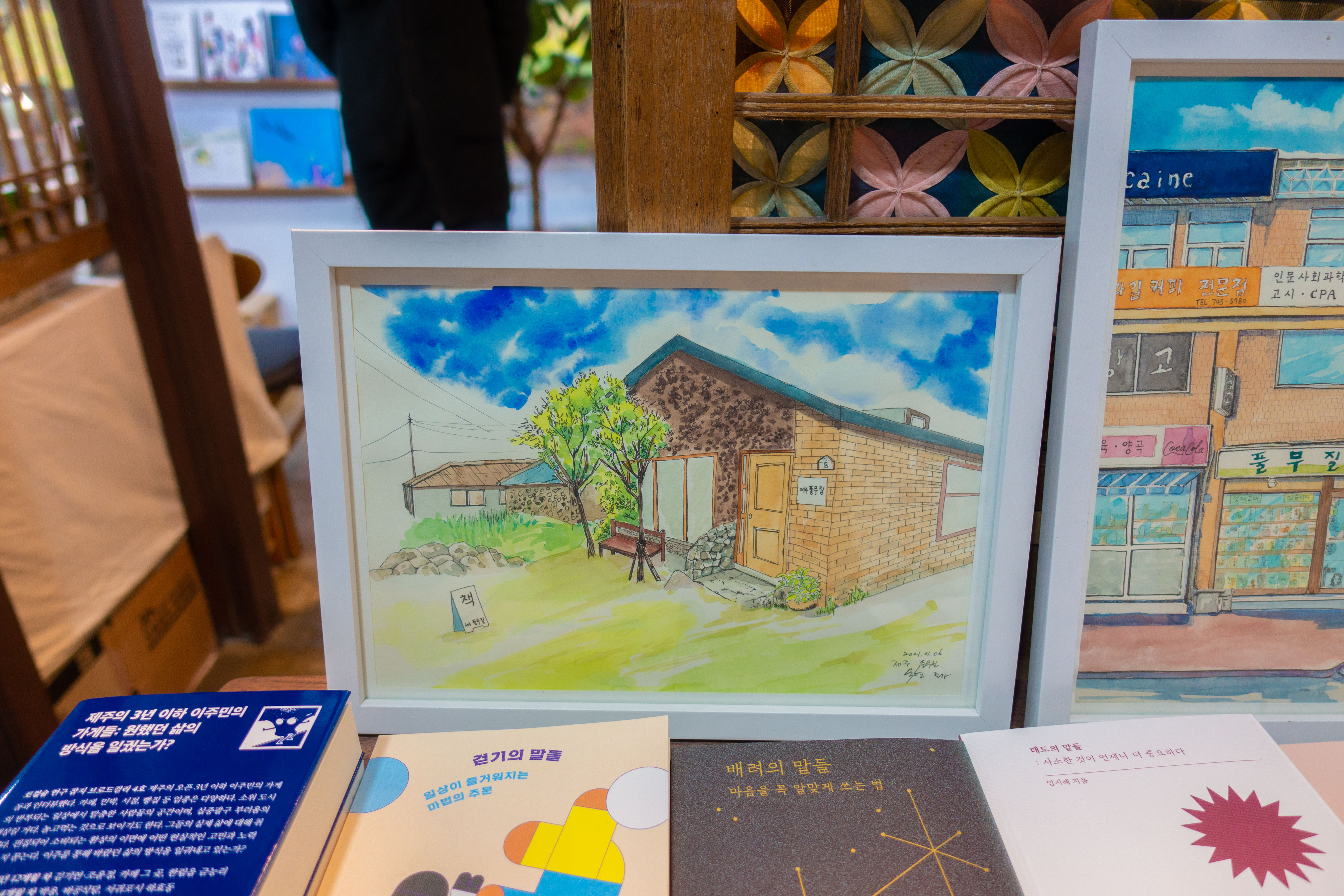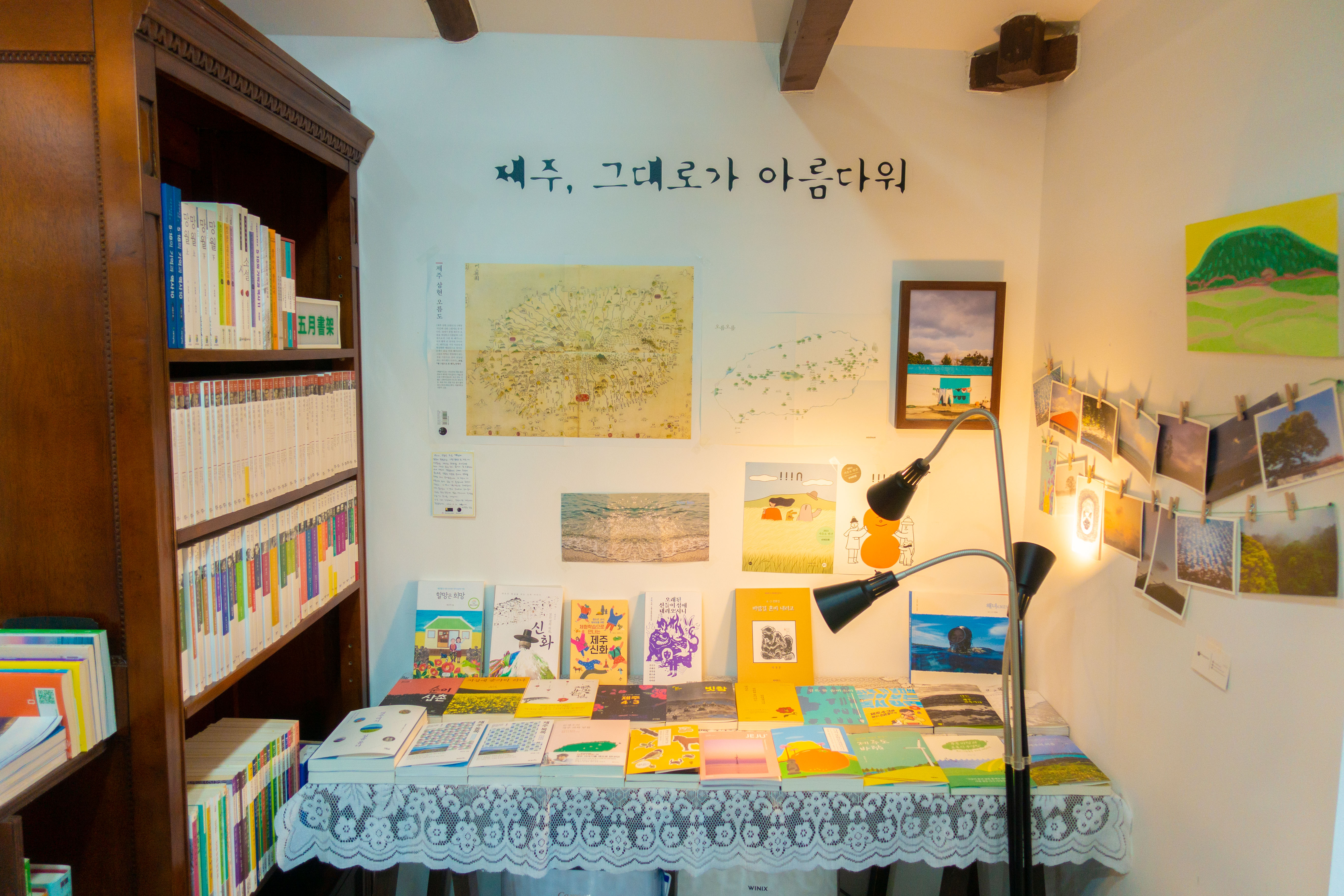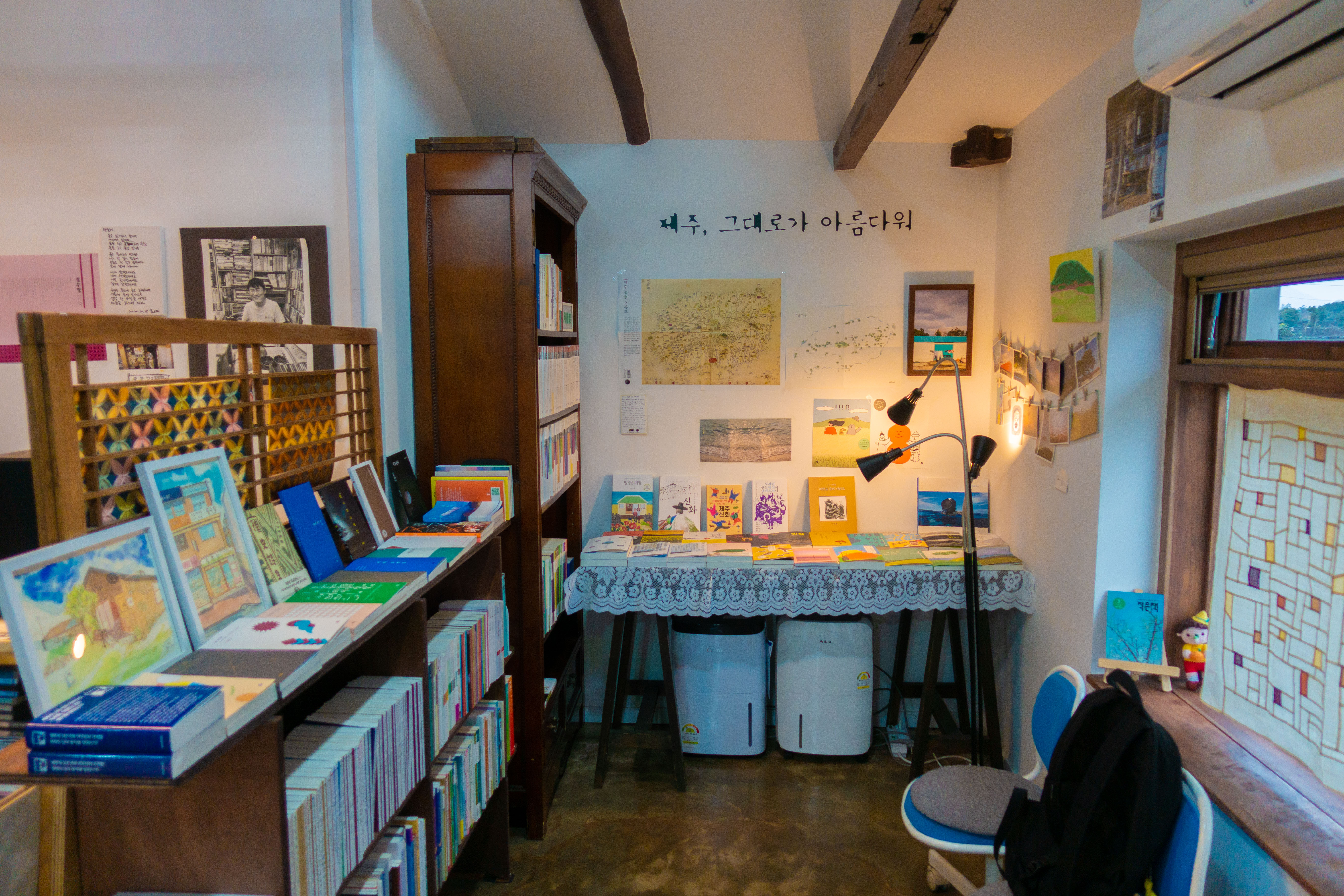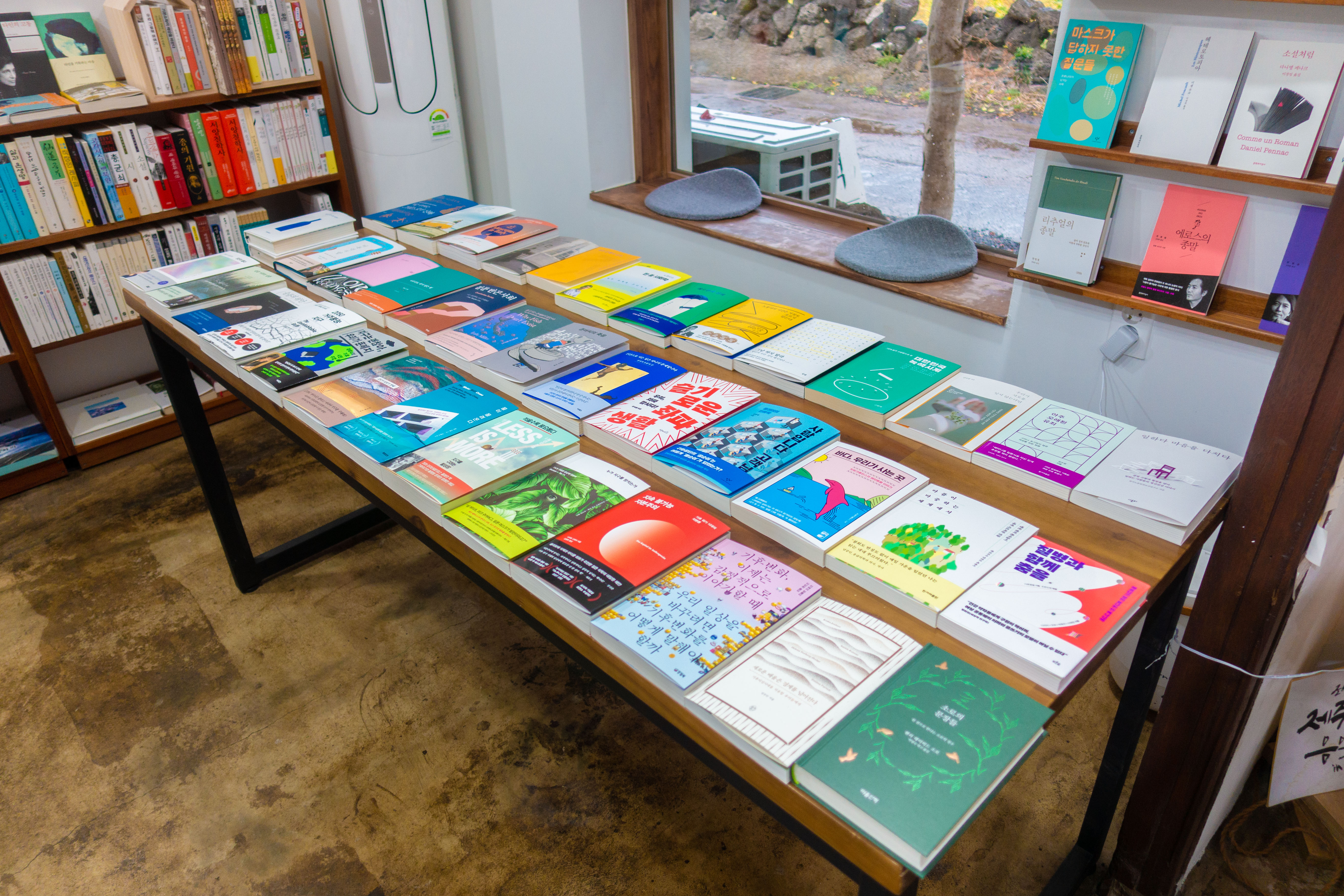 또한, 제주도의 경치와 어우러지는 작은 건물에 자리를 잡고 있어서, 도시의 서점과는 다른 느낌을 자아낸다. 제주도에서 볼 수 있는 작은 돌담들 사이에 있는 길을 따라서 들어가면, 이런 곳에 서점이 있을까 하는 생각을 하는 찰나에 눈앞에 보이는 서점을 찾을 수 있다.