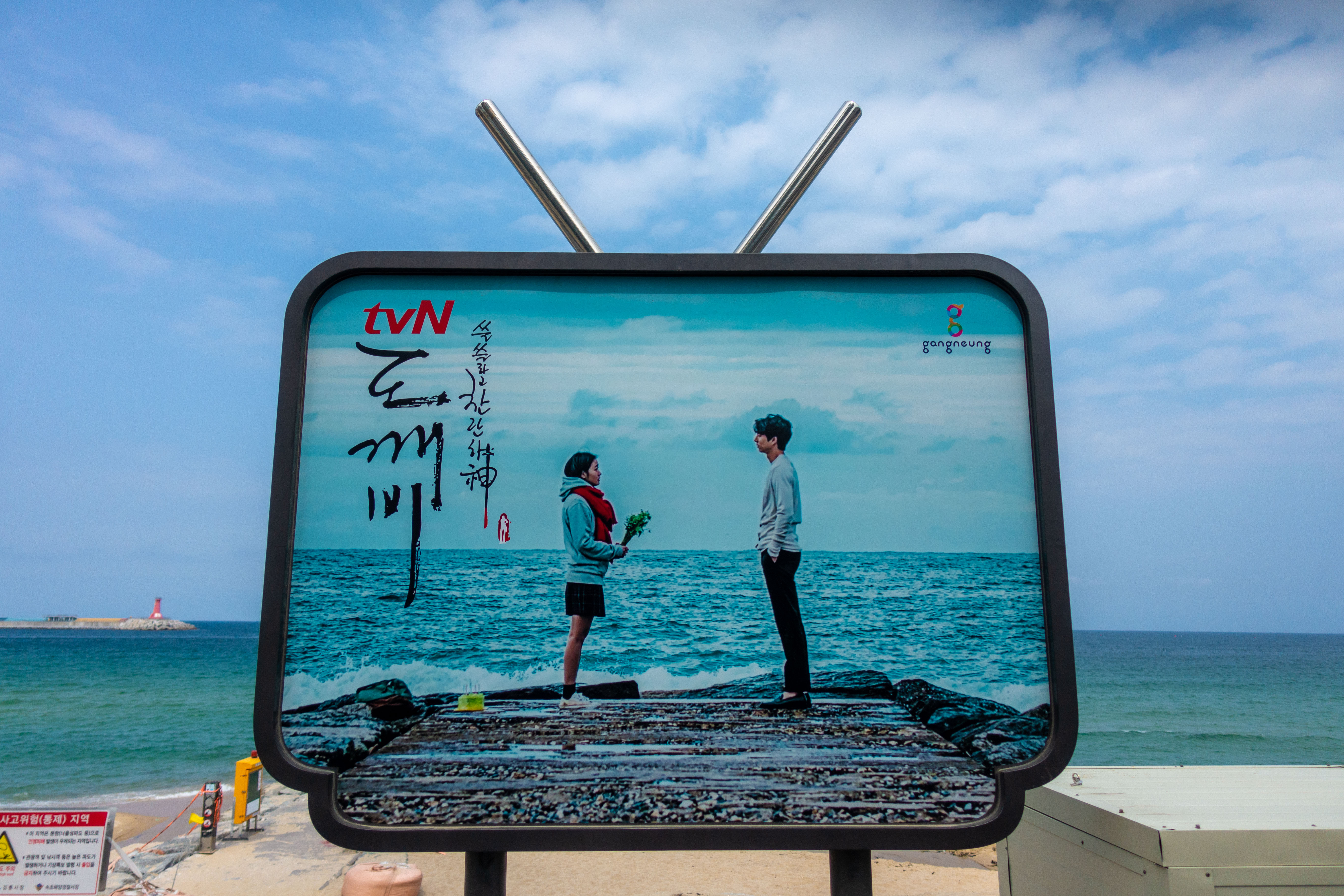 강릉 주문진에 있는 영진해변은 원래는 한적한 해변 마을이었으나, “도깨비”라는 드라마가 큰 인기를 끌면서 유명한 관광지로 변신했다.