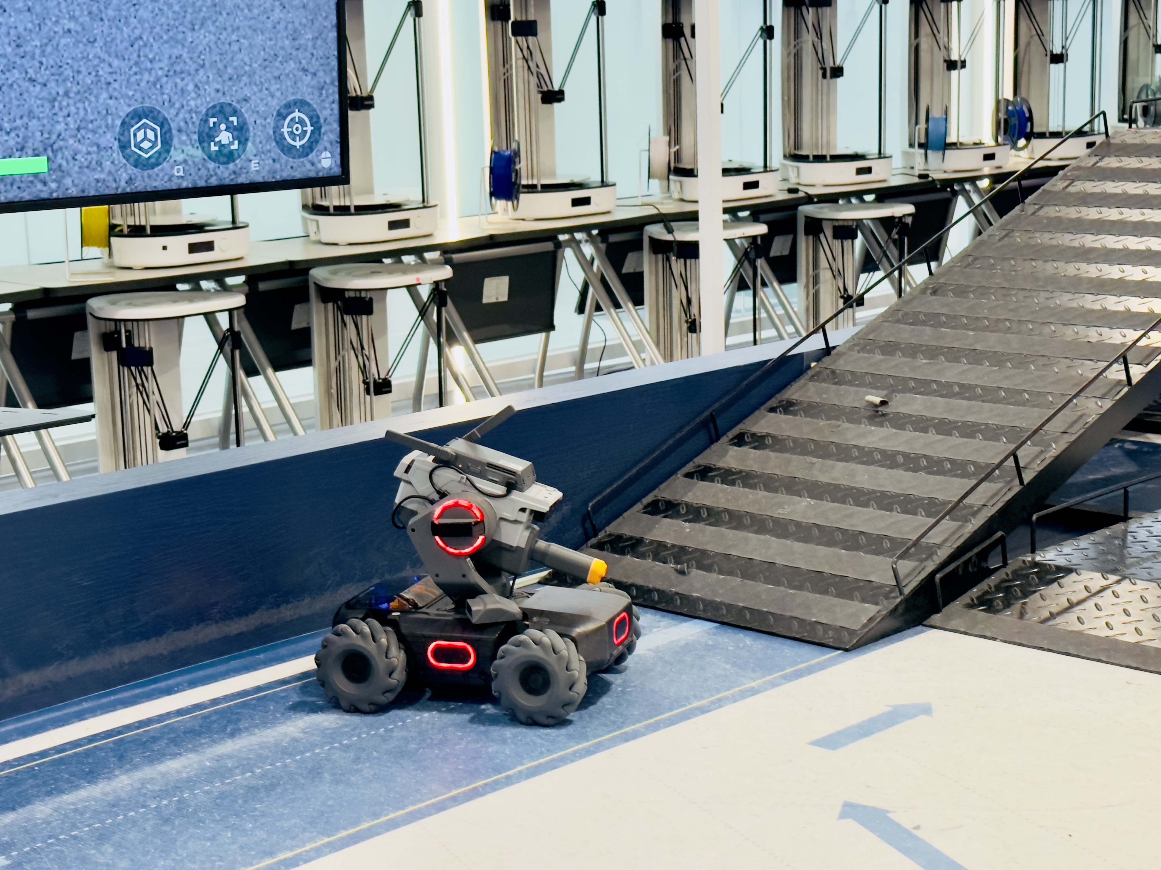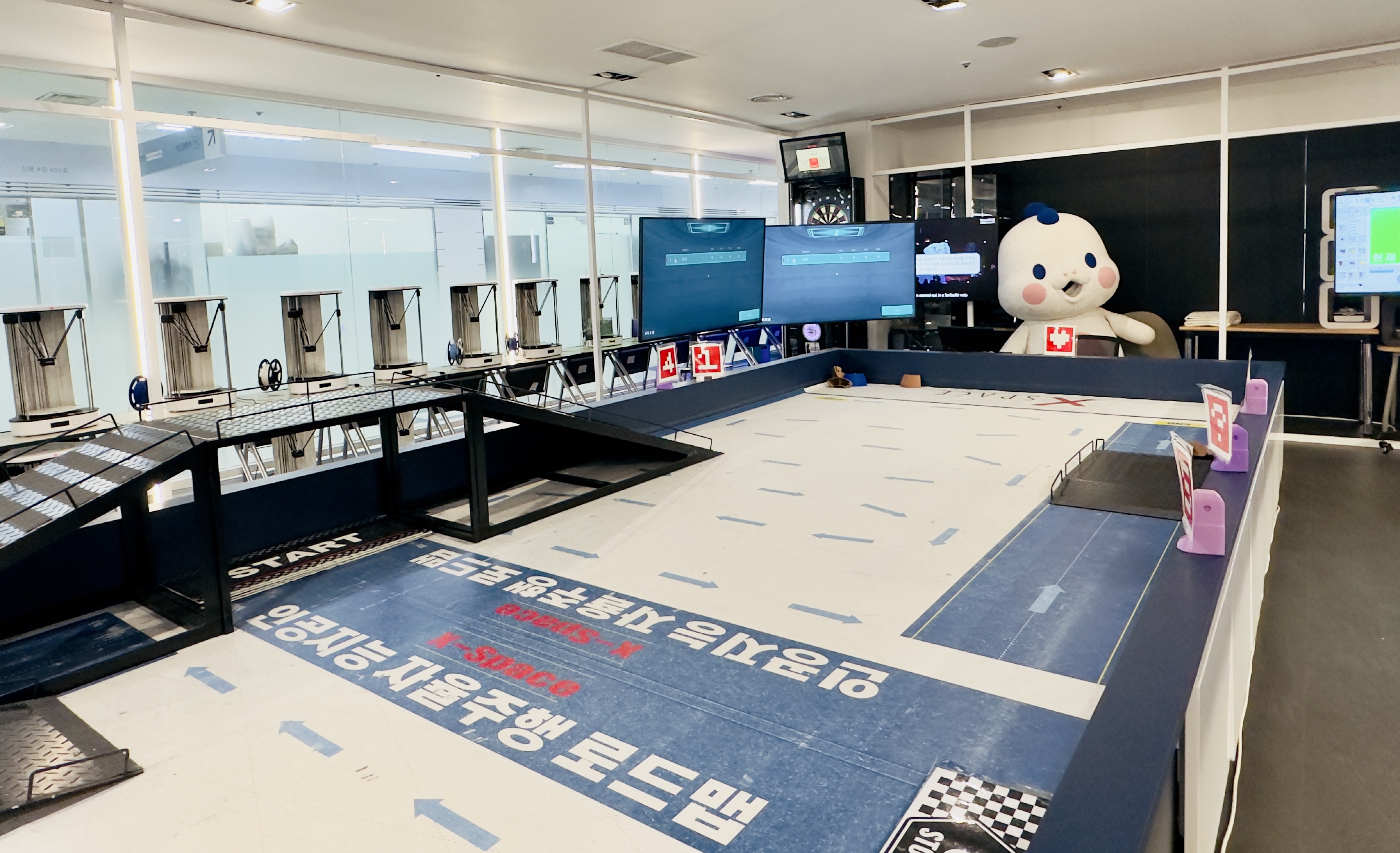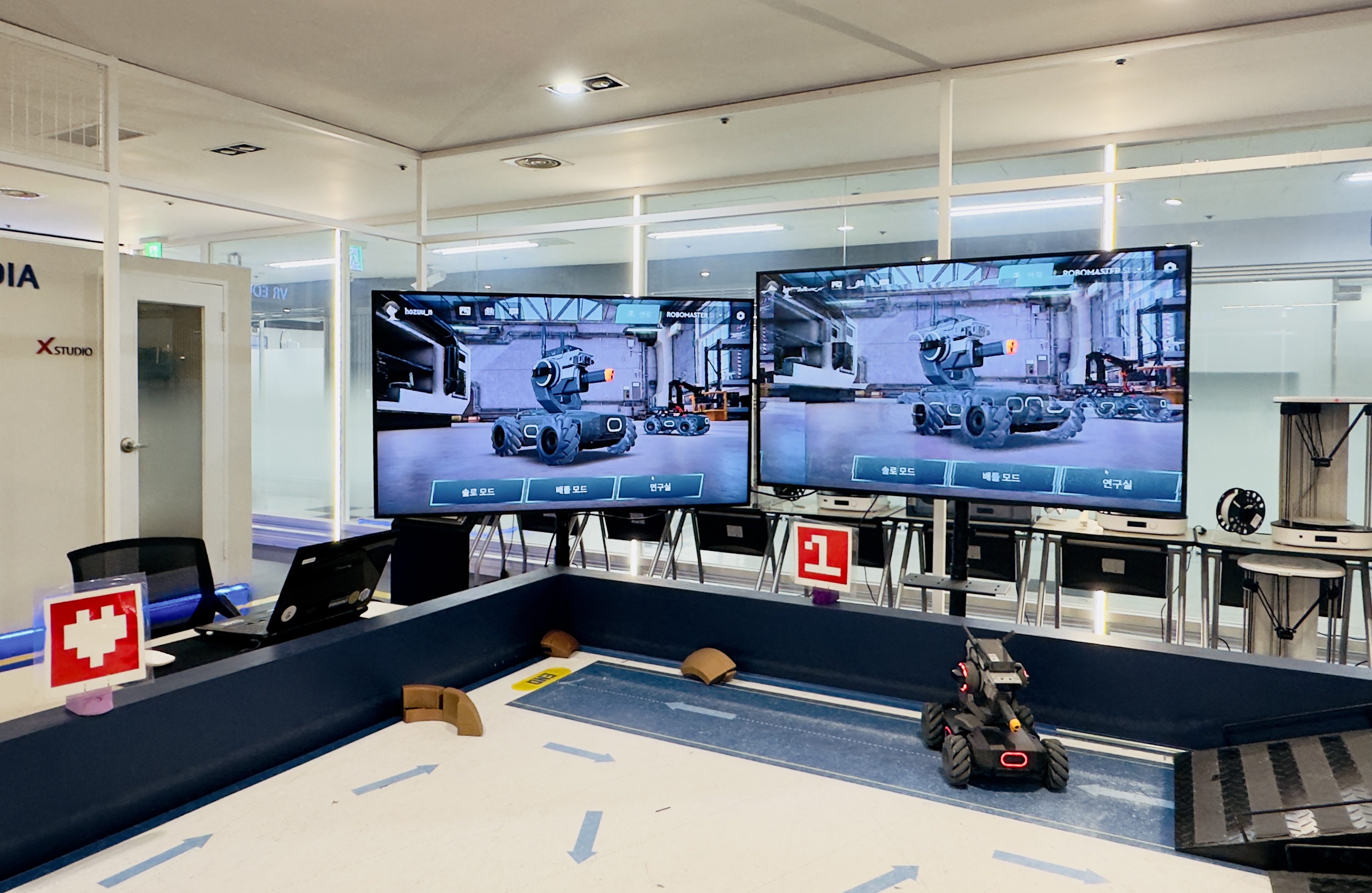 “X-SPACE”의 가운데를 차지하는 공간에서는 AR 기술을 활용한 로봇 대전을 체험할 수 있기도 하다. 현실 공간에 있는 로봇에 AR 기술을 접목시켜서 마치, “FPS” 게임을 하는 듯한 체험을 할 수 있는 공간이다. 이 공간은 로봇 코딩 공간으로 활용이 된다.